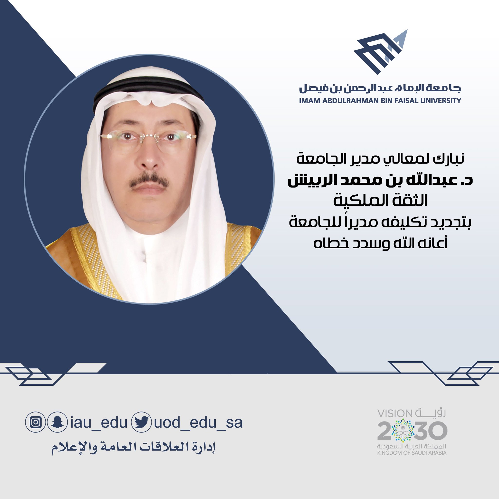 جامعة الإمام عــبدالرحــمن بن فيصل On Twitter نبارك لمعالي مدير الجامعة د عبدالله بن محمد الربيش الثقة الملكية بتجديد تكليفه مديرا للجامعة اعانه الله وسدد خطاه Https T Co Geiyvcwsd6