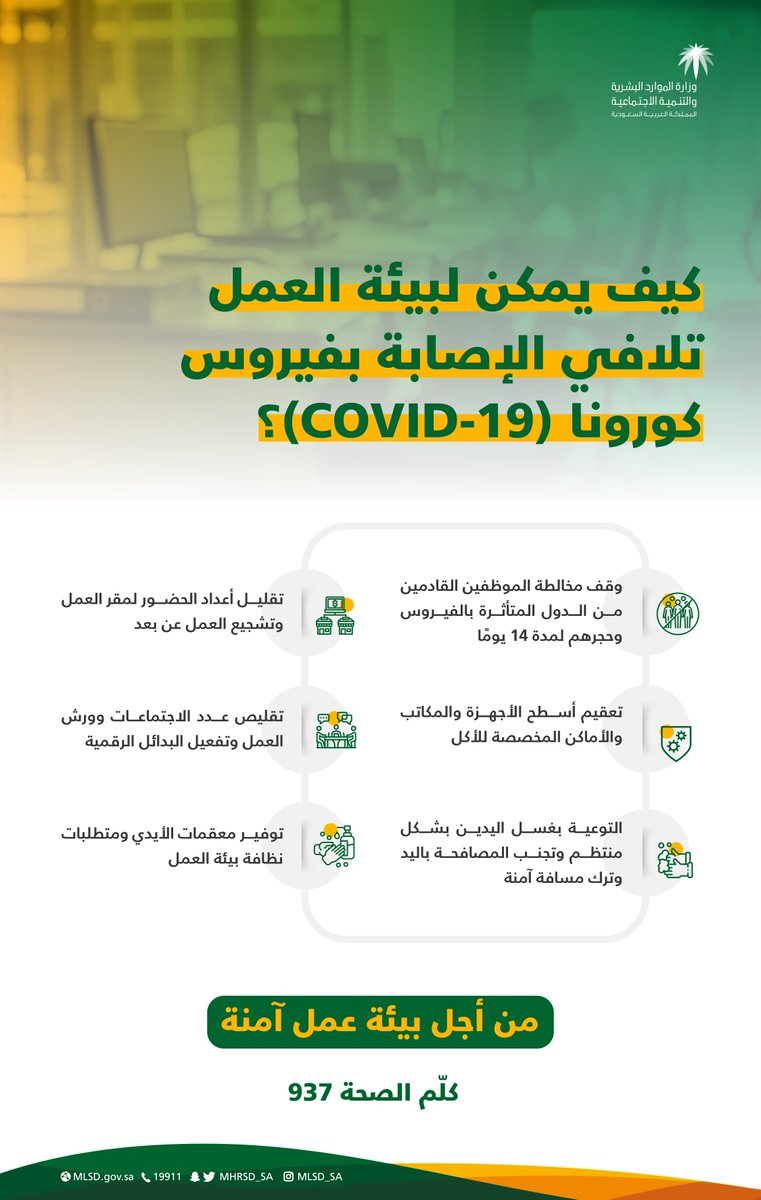 وزارة الموارد البشرية والتنمية الاجتماعية On Twitter تفضلوا بالاطلاع على الدليل الإرشادي للوقاية من فيروس كورونا الجديد Covid 19 في مكان العمل Https T Co Q5oxta8n6i Https T Co U4if3bm4pk