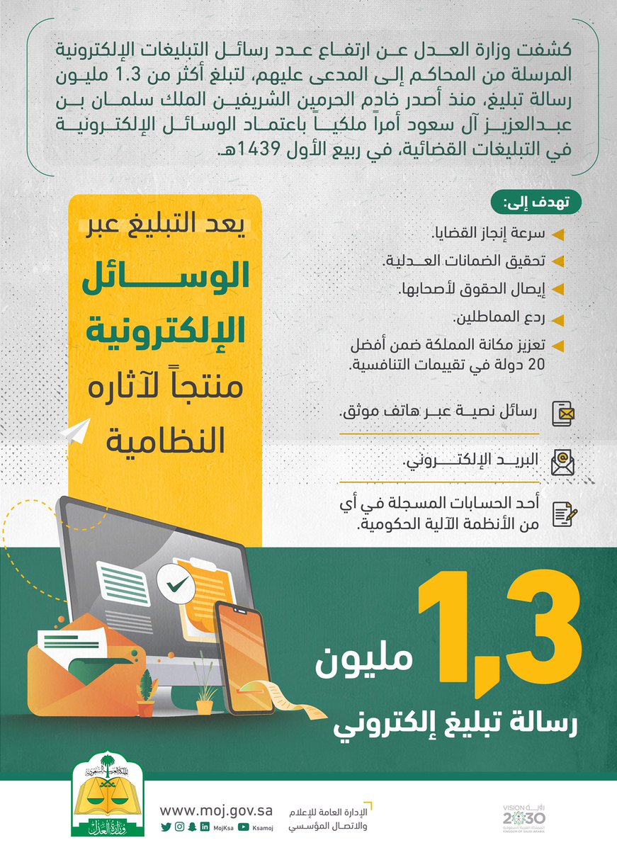 وزارة العدل V Twitter أرقام عدلية بلغ عدد رسائل التبليغات الإلكترونية التي أرسلتها المحاكم إلى المدعى عليهم أكثر من 1 3 مليون رسالة